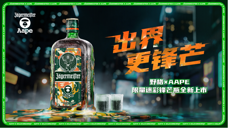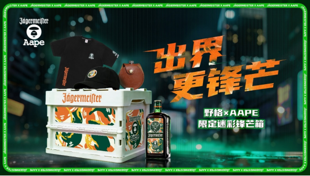 2026年1月15日,国际街头潮流品牌AAPE联手德国先锋利口酒品牌野格(Jägermeister),重磅官宣以「出界更锋芒」为主题的首个跨界联名。此番合作打破酒饮与时尚的传统界限,将AAPE象征的街潮内核融合野格代表的冒险基因,共同打造「迷彩锋芒瓶」和「迷彩锋芒箱」两大潮夜专属联名产品,为年轻世代呈现了一场兼具个性表达与文化共鸣的无界潮流盛宴。